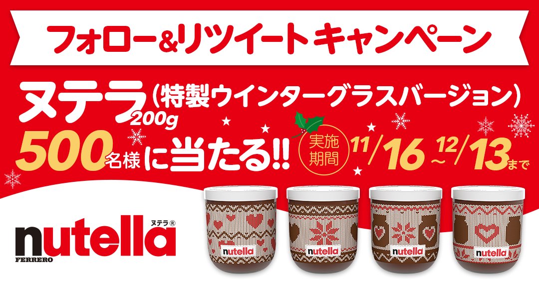 ヌテラ nutellaで2020年冬のTwitter無料懸賞キャンペーンを実施中です。キャンペーン期間中にヌテラ nutella キャンペーンツイートをRTリツイートして応募すると、抽選で500名様にヌテラ nutella 特製ウインターグラスヴァージョンが当たります。