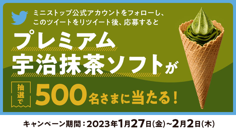 ミニストップで2023年の宇治抹茶ソフト無料プレゼント懸賞キャンペーンを実施中です。キャンペーン期間中にミニストップ公式Twitterをフォロー&RTして応募すると、抽選で500名様にミニストップ プレミアム宇治抹茶ソフト 無料引き換えクーポンが当たります。